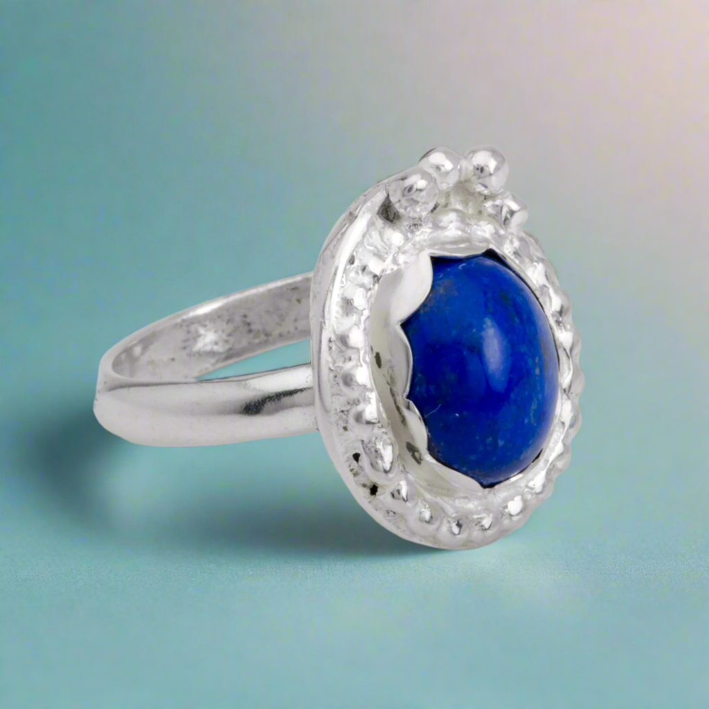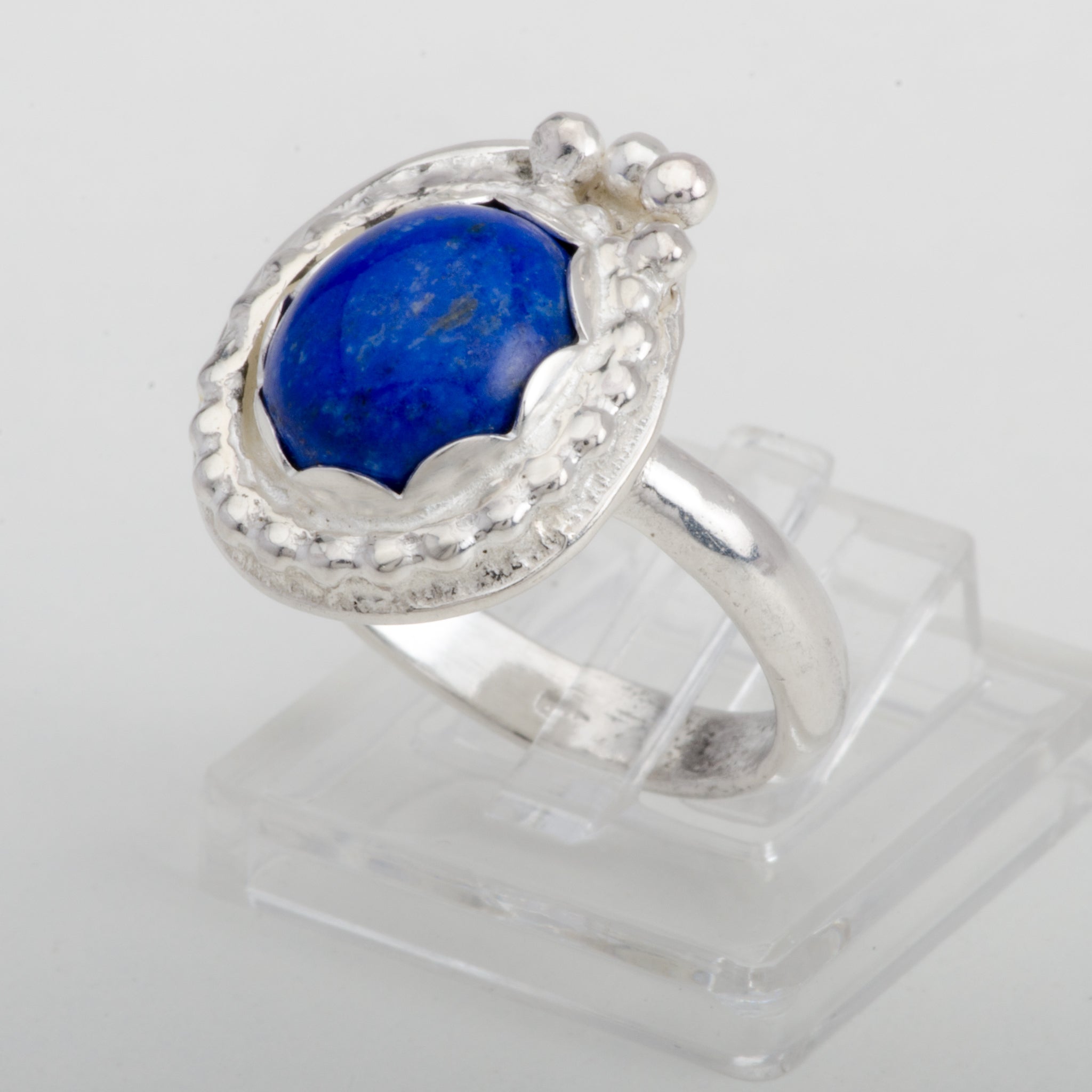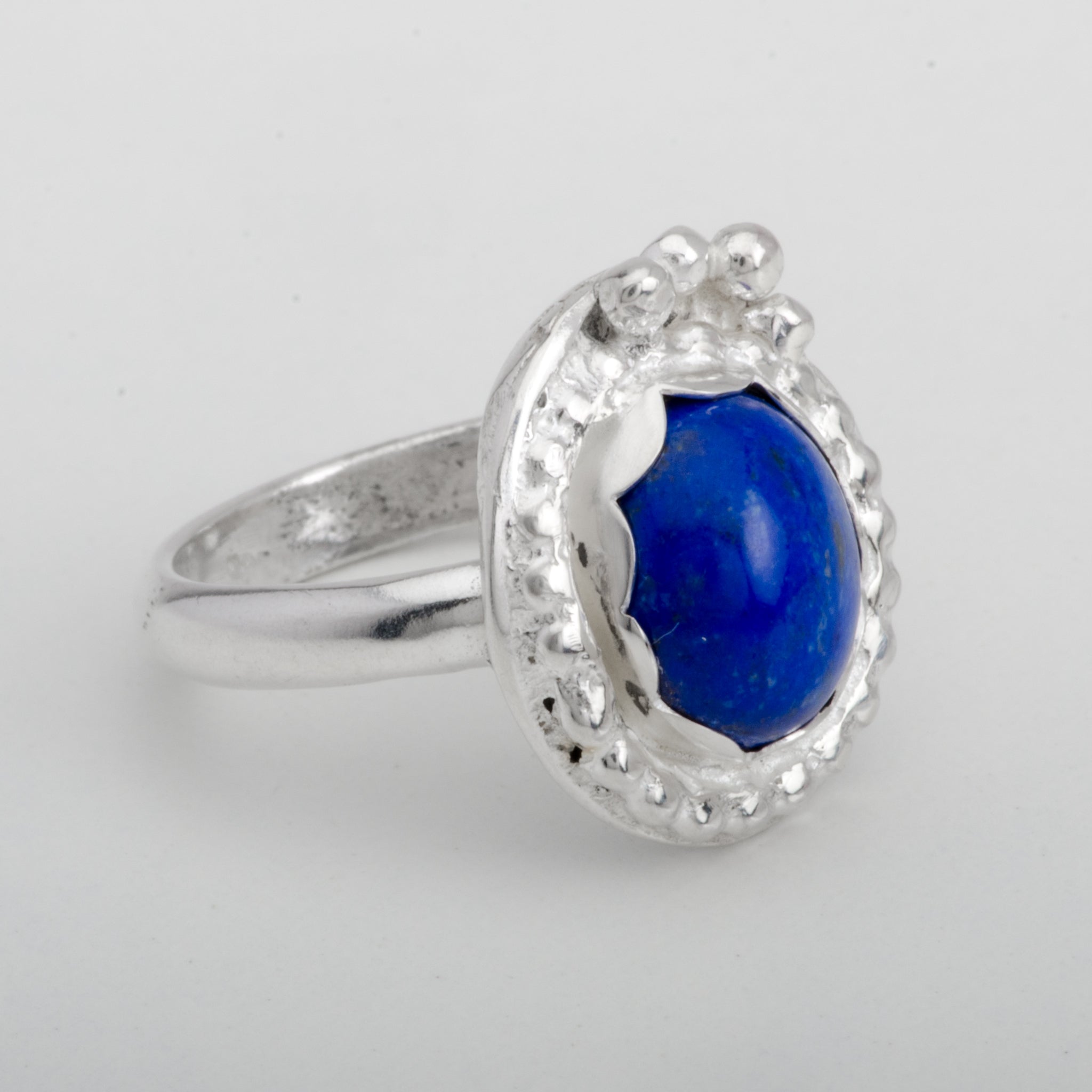 This "Kuni" ring is handmade in 925 sterling silver in my workshop. It features a lovely Lapis Lazuli gemstone cabochon and finely crafted silver decorations.