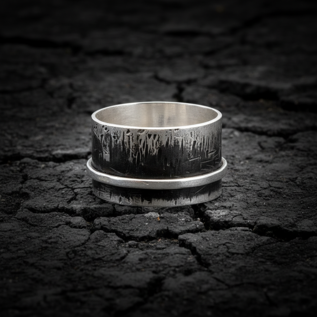 Audacieuse. Saisissante. Inoubliable. La bague « Kenzi ». Cette bague en argent sterling 925, façonnée à la main, canalise la puissance brute de l'héritage samouraï grâce à sa superbe finition Mokume-gane, un motif qui ornait autrefois les lames japonaises légendaires. Chaque couche raconte une histoire de travail du métal magistral et de design intrépide.